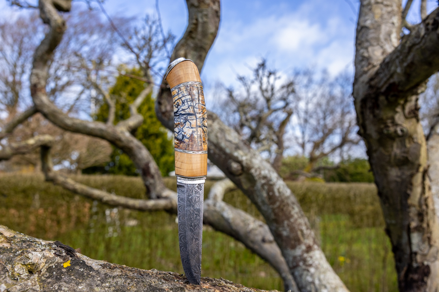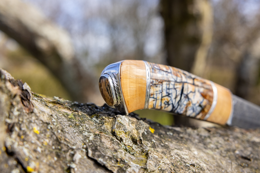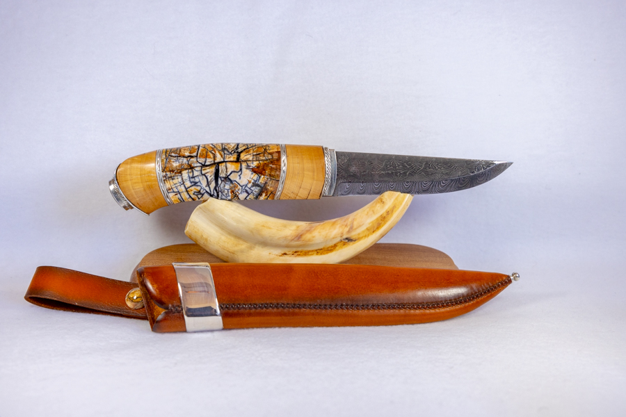 Front og bagholk er i 1mm sølv 925, der er loddet en sølvplade på frontholken, som går ud på klingen som en dekoration, og på den er der en flettet sølv tråd som er loddet på som dekoration, på bagholken er der lavet en sølv kant hvor der er lagt et stykke stabiliseret mammut i, og på den ramme er der også lagt en flettet sølv tråd som dekoration.