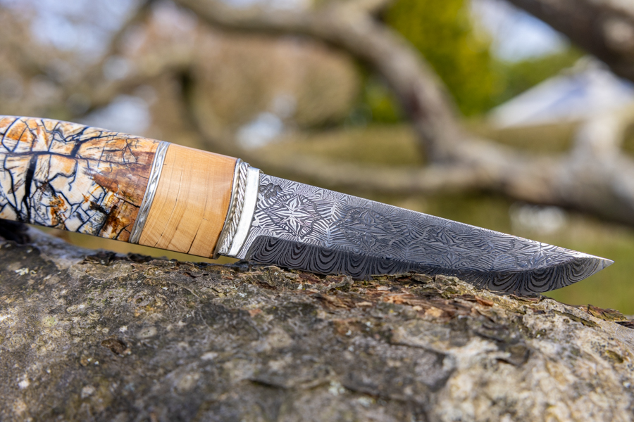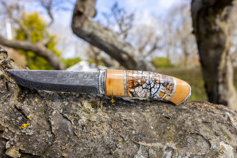 Denne klinge er lavet af Asbjørn Solheim fra Norge, en af Norge´s dygtige bladsmede, det er en mønster smedet klinge som Asbjørn har lavet til mig.