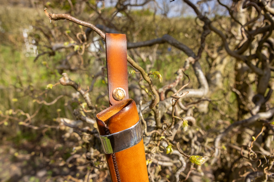 Skeden er kernelæder med en stor sølv ring i toppen af skeden, som står blank, samt en drejet tut af sølv 925 i bunden af skeden.