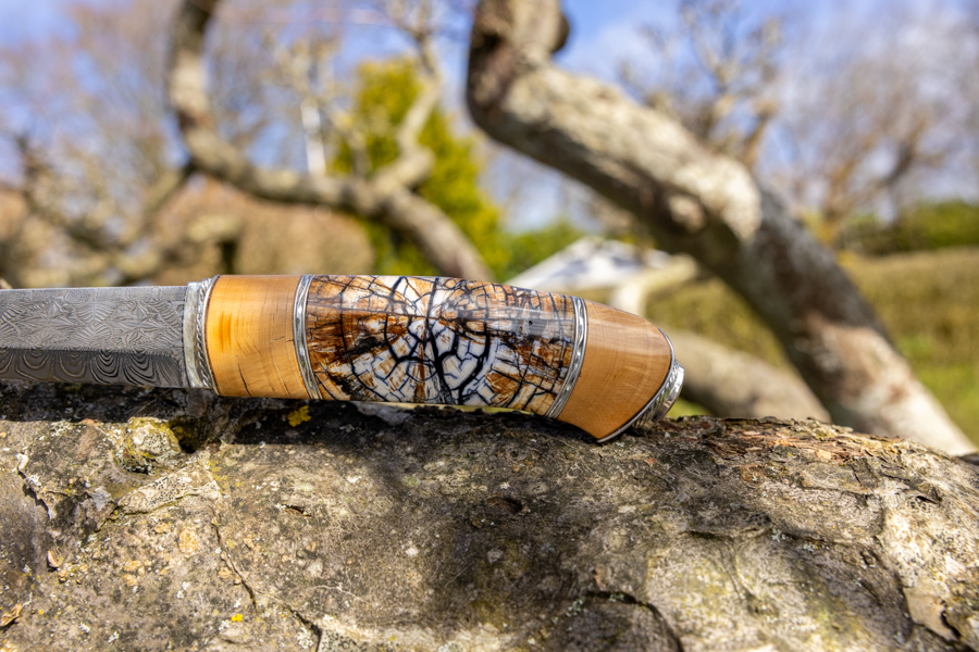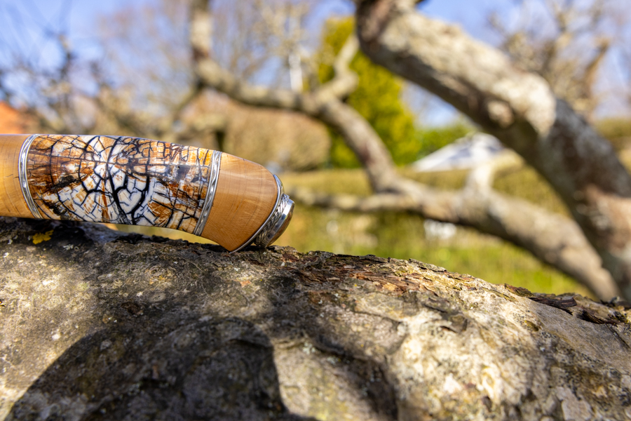 Skæftet er i midten et fint stykke stabiliseret mammut stødtand, i lysbrune nuancer, så er der brugt to flotte stykker naturlig lysbrune mammut stødtand, desuden er der 4 stk 0,7mm skiver sølv, 2 skiver 1,5mm sølv 925 skiver.