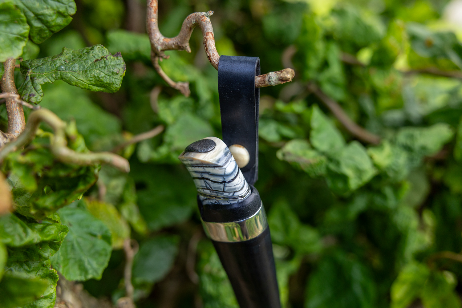 Skeden er kernelæder farvet sort, med en stor sølv ring i toppen af skeden som står blankt, samt en lille drejet kugle af sølv 925 i bunden af skeden.