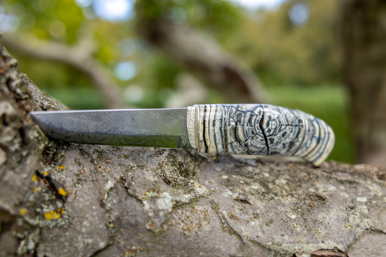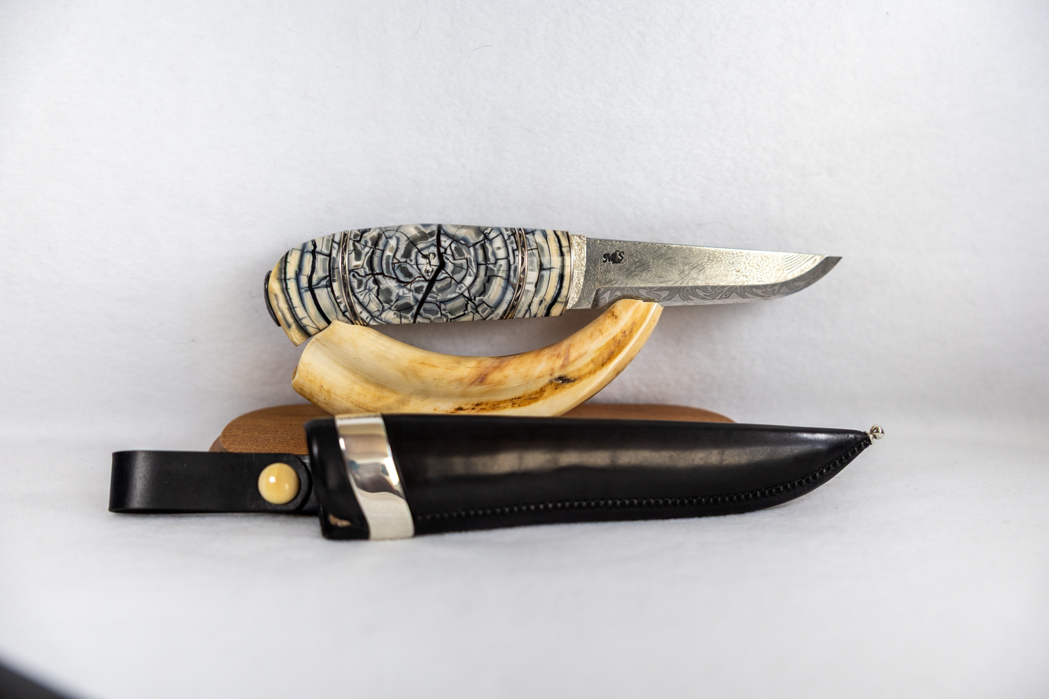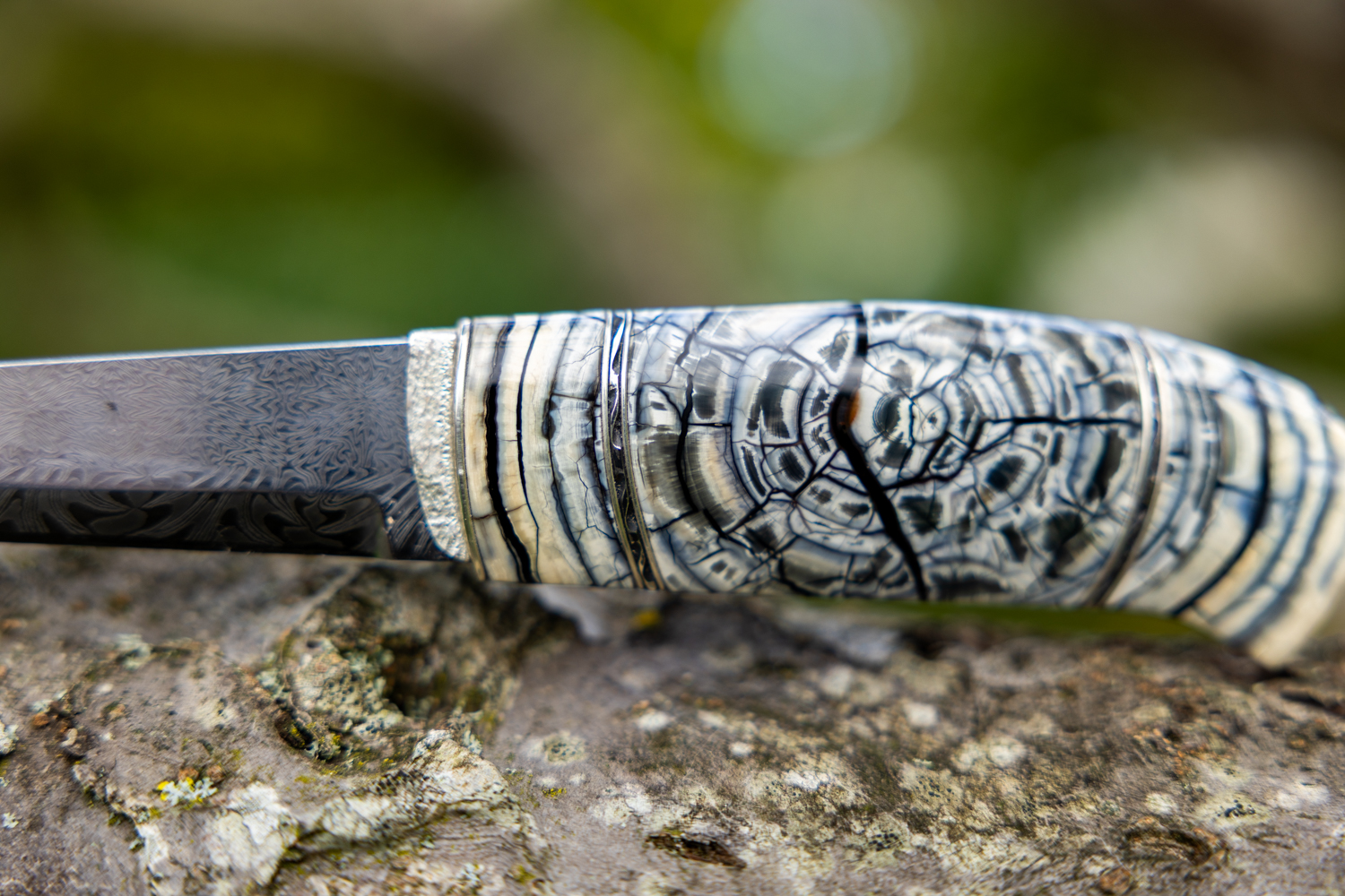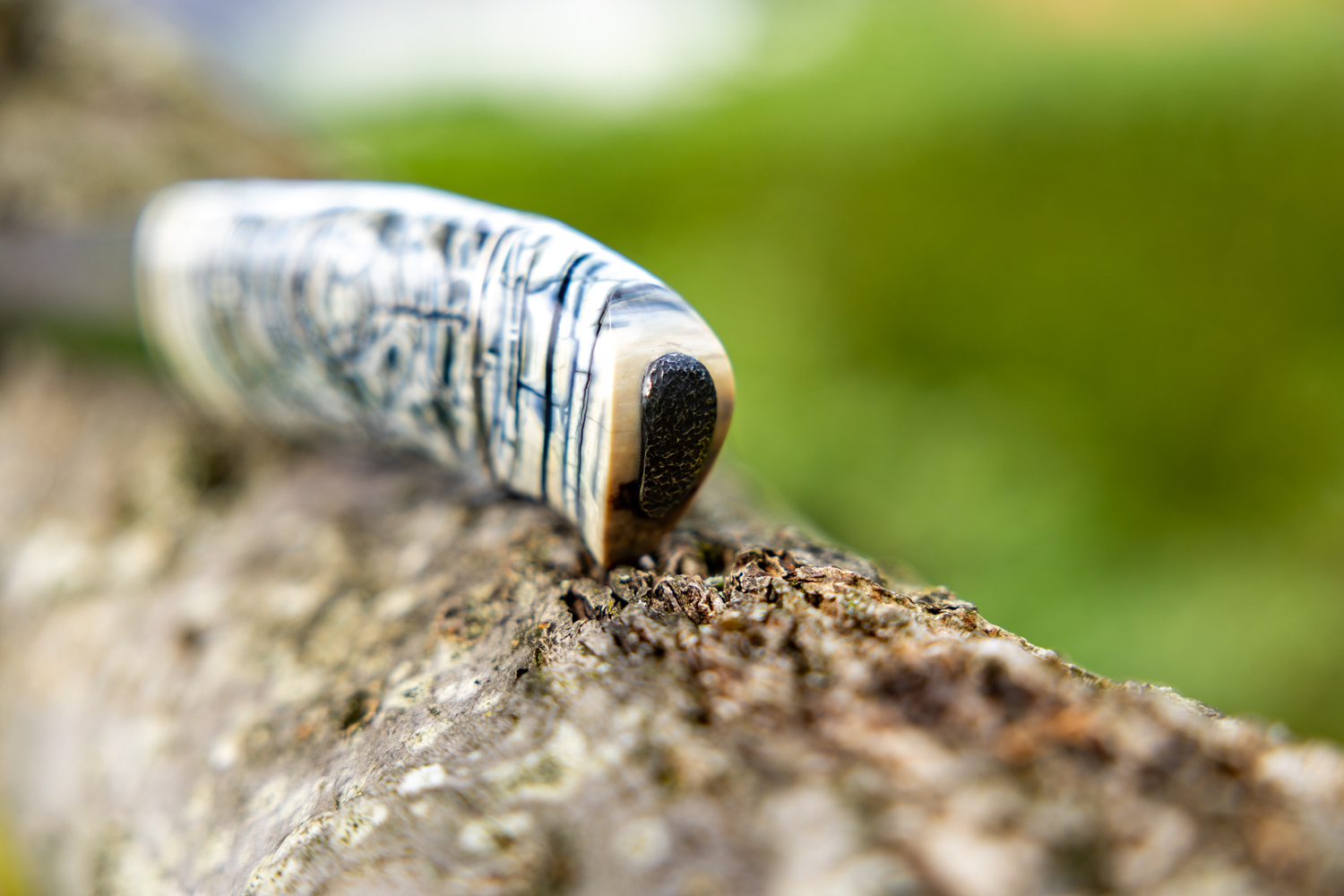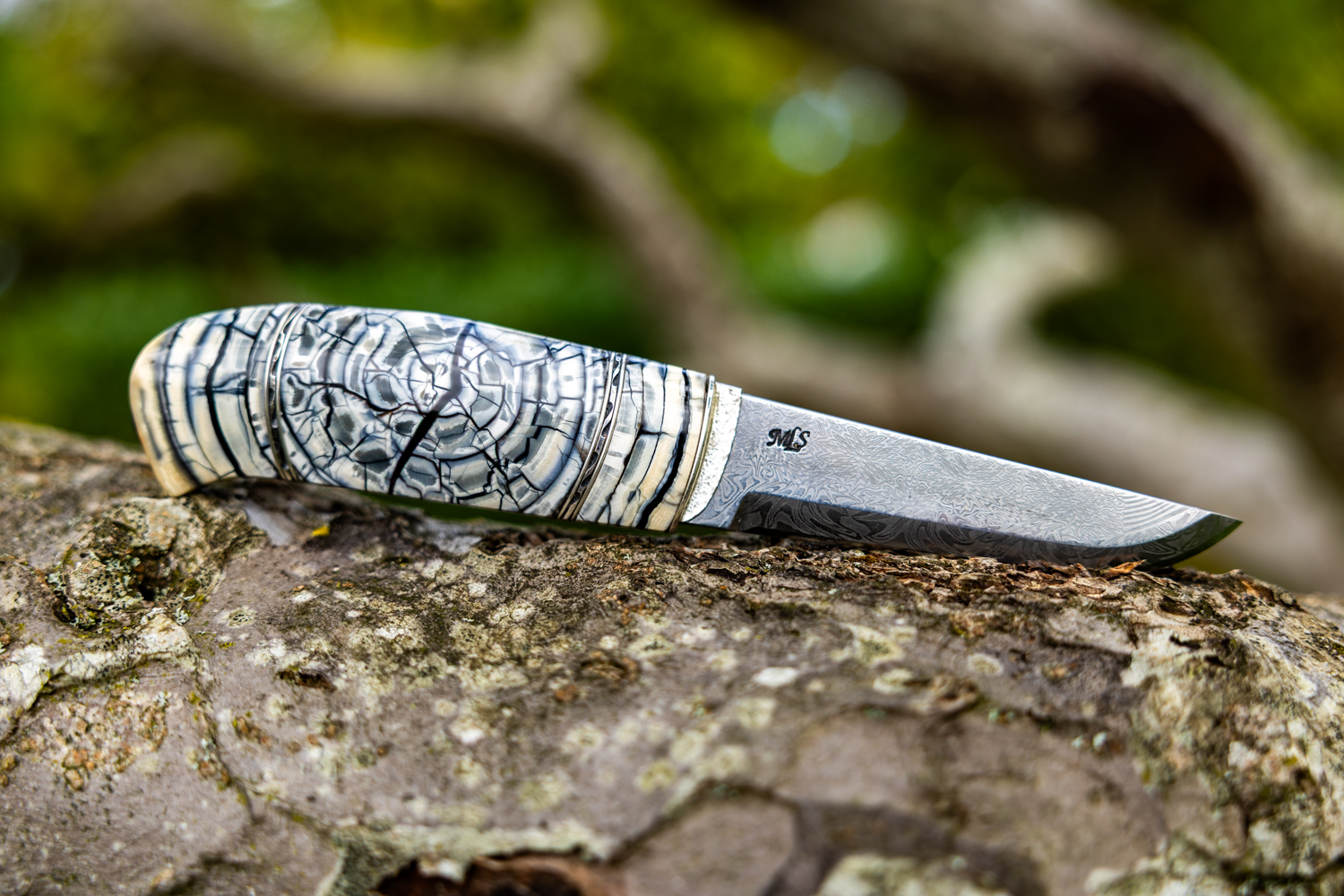 Skæftet er et fantastisk stykke stabiliseret hvid mammut stødtand, desuden er der 2 stk 1,5mm skiver sølv, 4 skive 0,7mm sølv 925 skiver.